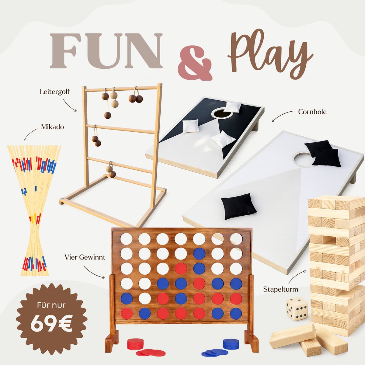 Im Kombi-Paket enthalten sind Cornhole, Leitergolf, Vier Gewinnt, Mikado sowie ein Stapelturm.