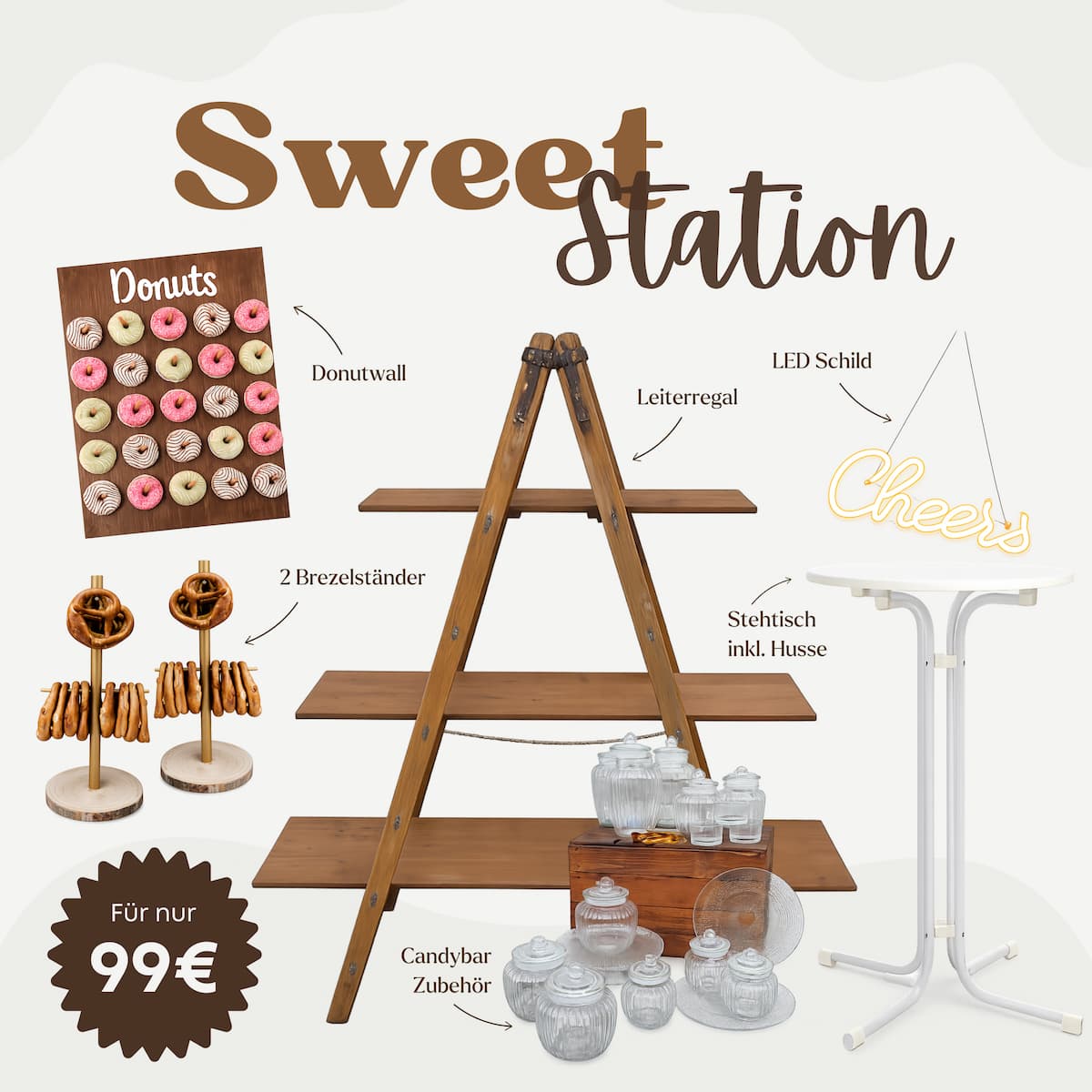 Die Sweet Station ist das perfekte Highlight für euren Sektempfang, die Kaffeepause oder als liebevoll gestaltete Nasch-Ecke. Das Herzstück bildet ein Leiterregal (optional wählbar: Leiterregal Leo oder Leiterregal Lia), das ideal für Snacks oder Gläser genutzt werden kann. Ergänzt wird das Set durch eine Donutwall, zwei Brezelständer, Candybar-Zubehör, ein LED-Schild „Cheers“ sowie einen Stehtisch inkl. Husse (wahlweise schwarz oder weiß).