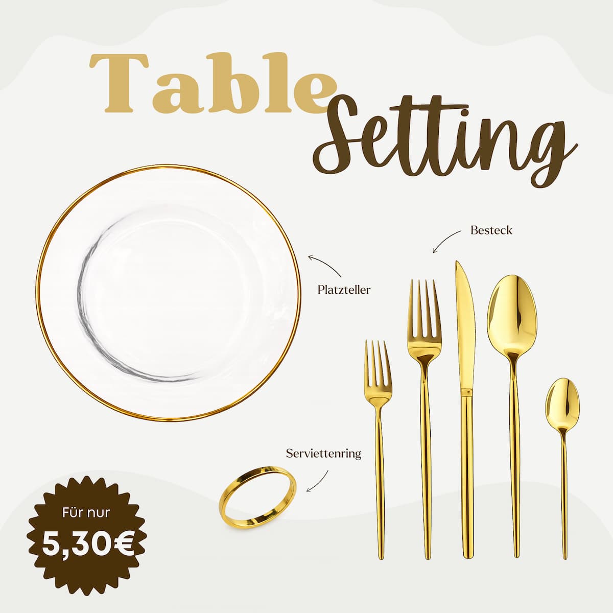 Im Set enthalten sind Platzteller, goldenes Besteck sowie Serviettenringe, die jedem Gedeck eine elegante und hochwertige Optik verleihen.