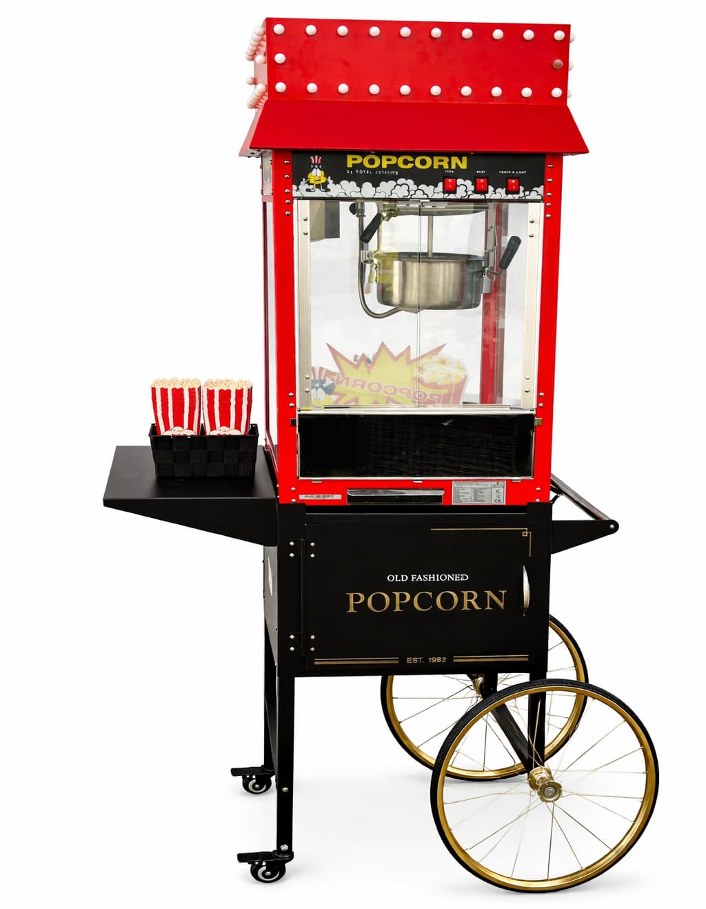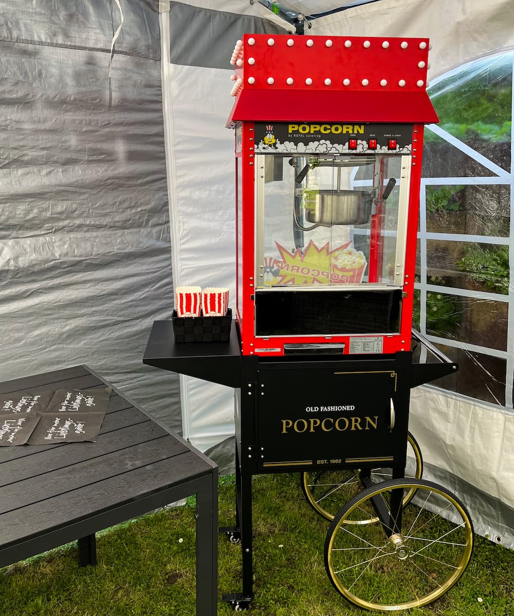 Popcornmaschine Pippa liefert frisch zubereitetes Popcorn für eure Gäste. Das Komplettset umfasst Mais, Zucker, Öl und Tüten — sofort einsatzbereit.