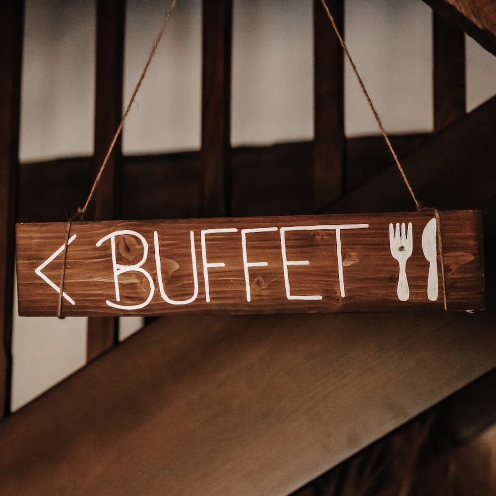 Buffet Bella weist klar darauf hin, wo sich Gäste am Buffet bedienen können.