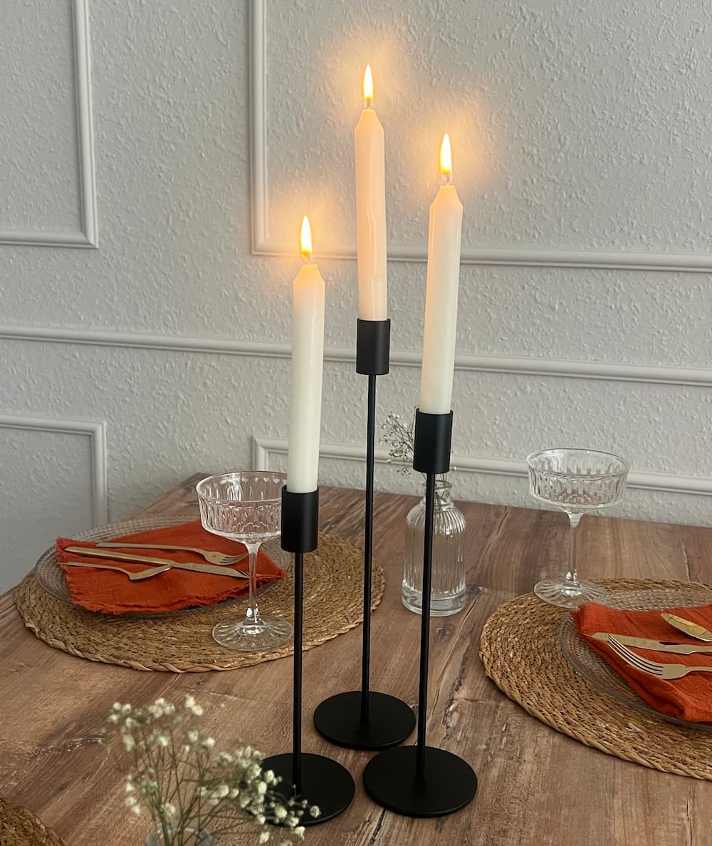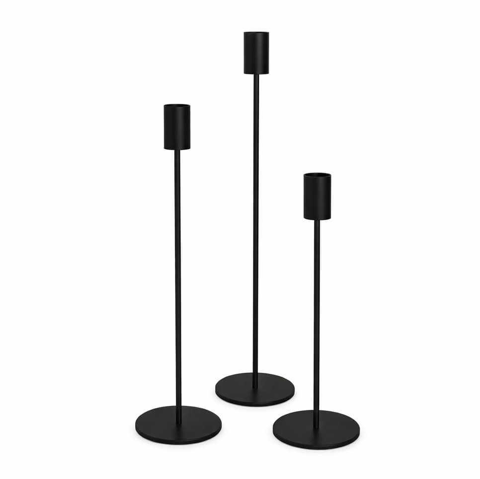 Kerzenständer Klare besteht aus drei mattschwarzen Stabkerzenhaltern, die durch ihre klare Formgebung sehr ruhig und strukturiert wirken. Ideal für moderne Hochzeiten, klare Linien und kontrastreiche Konzepte.