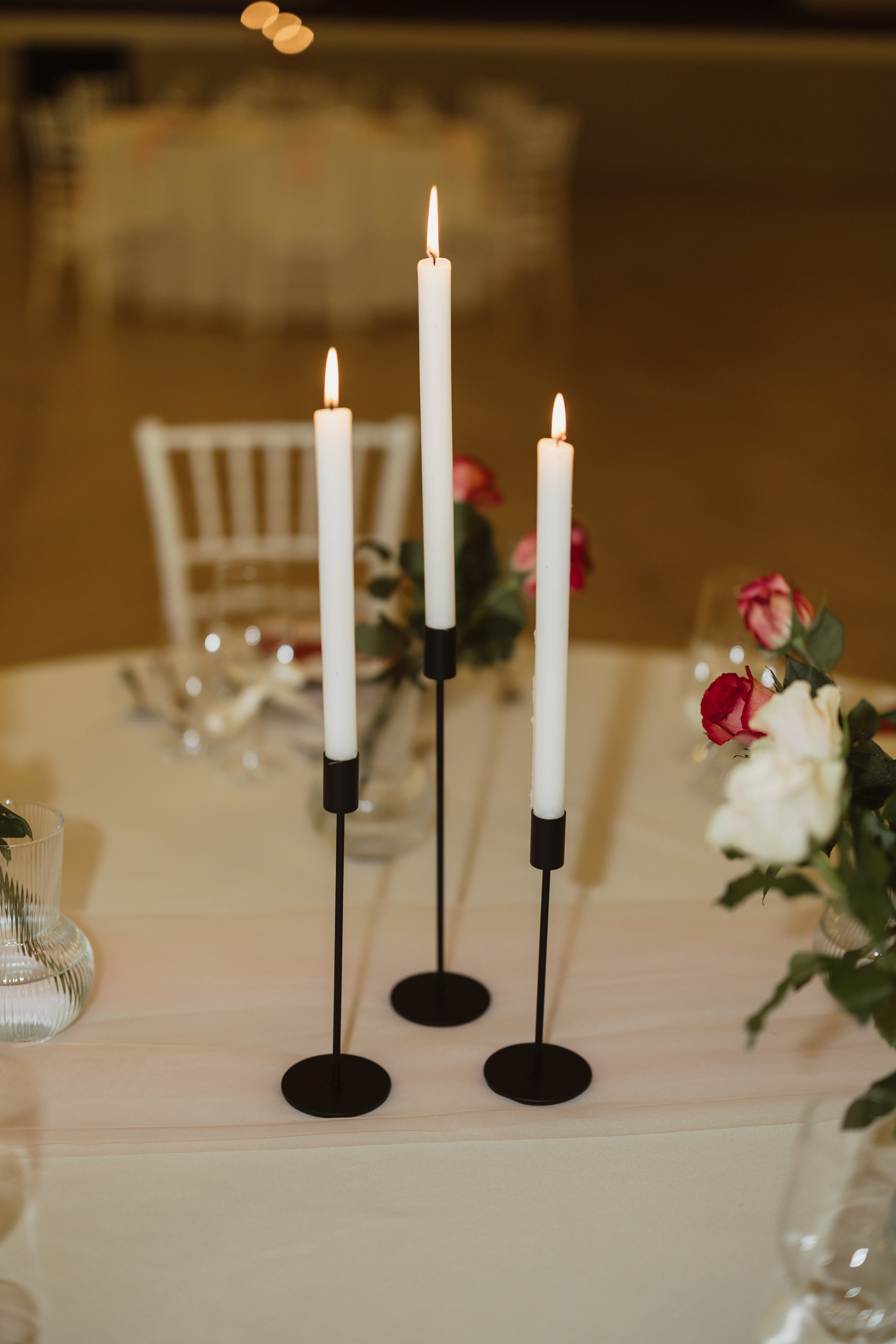 Kerzenständer Klare besteht aus drei mattschwarzen Stabkerzenhaltern, die durch ihre klare Formgebung sehr ruhig und strukturiert wirken. Ideal für moderne Hochzeiten, klare Linien und kontrastreiche Konzepte.