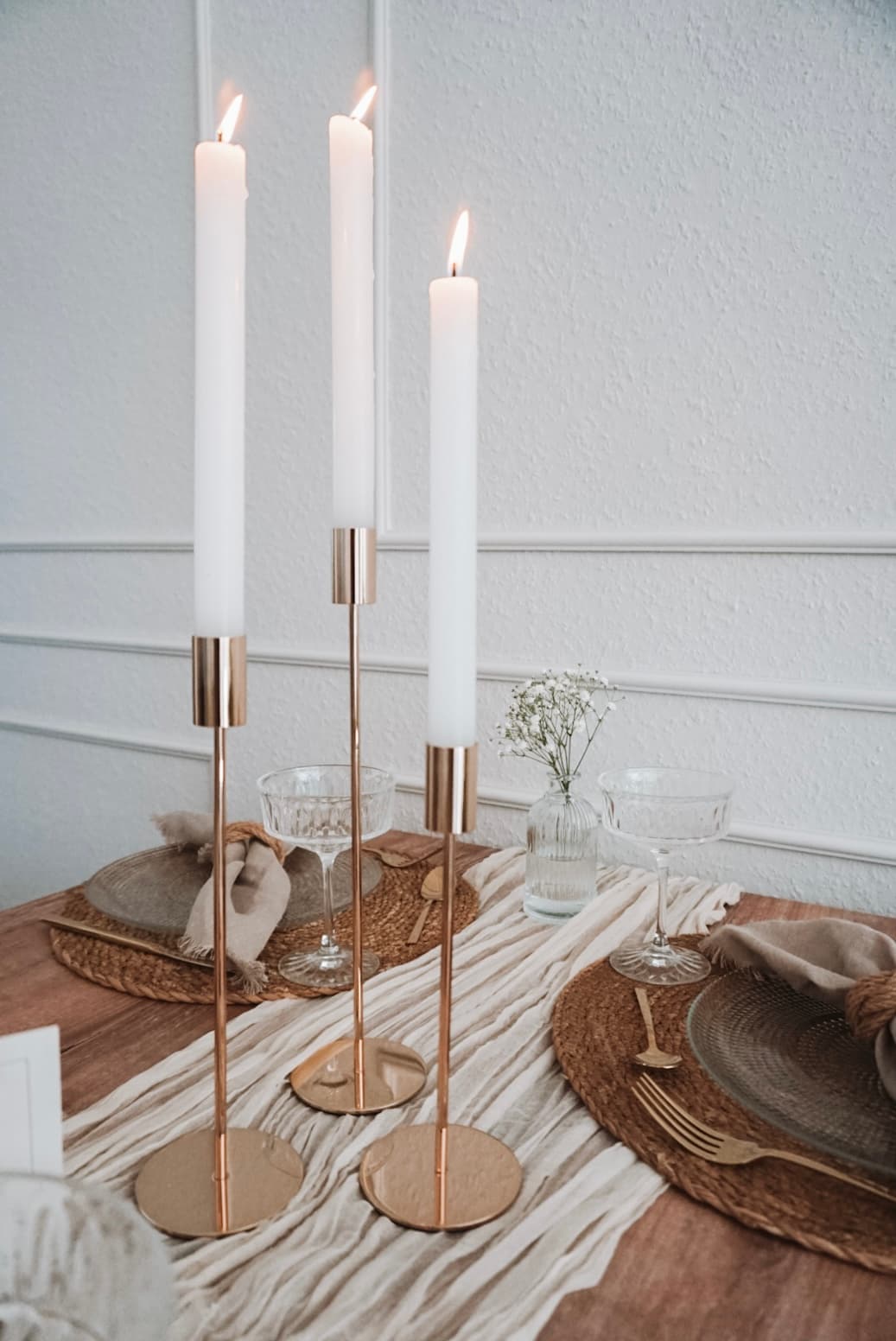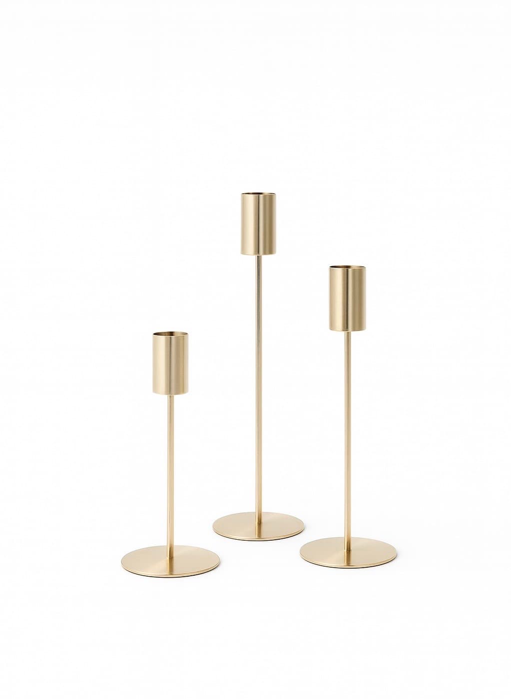 Kerzenständer Kora besteht aus drei goldenen Stabkerzenhaltern und eignet sich besonders gut für warme Farbkombinationen, Holz, Weiß- und Naturtöne. Die abgestuften Höhen ergänzen Tischreihen oder runde Tische.