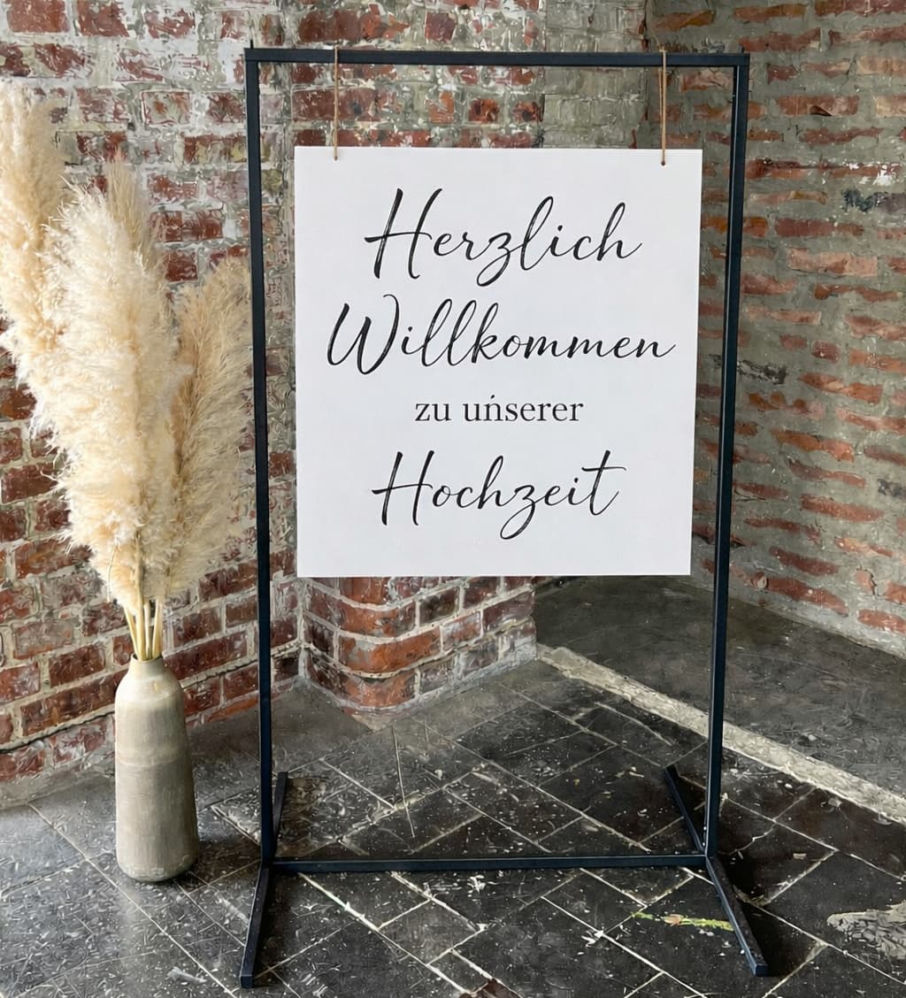 Metallständer Maui trägt Willkommensspiegel oder Sitzpläne und setzt sie deutlich sichtbar in Szene. Seine Konstruktion ermöglicht schnelles Aufstellen und sicheren Halt bei Indoor- und Outdoor-Events.