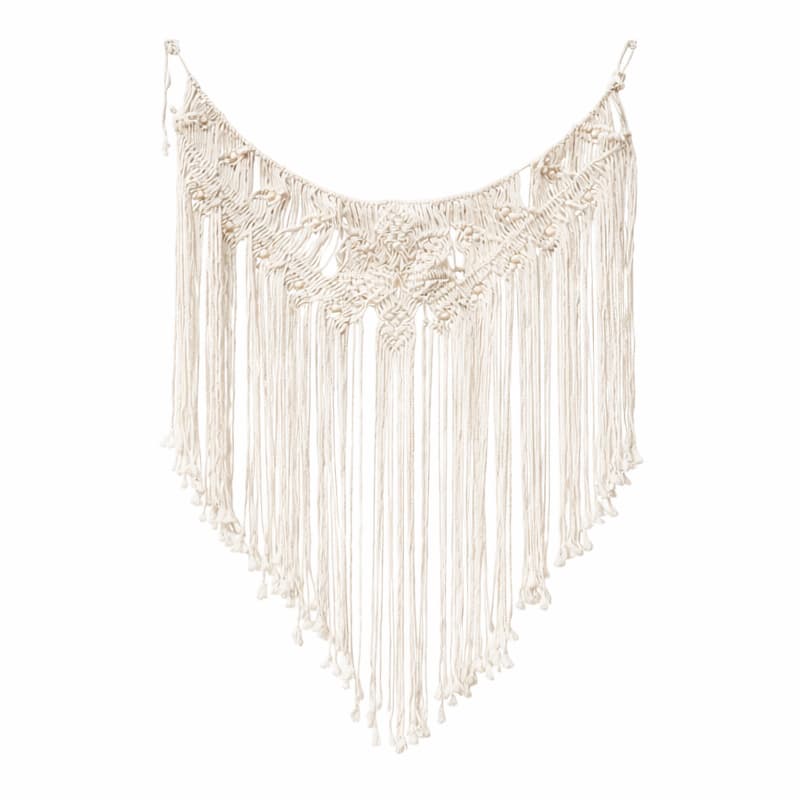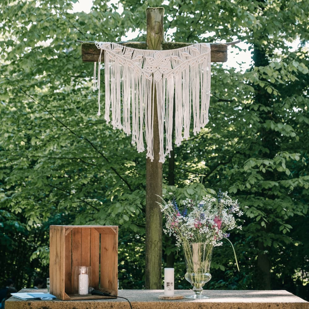 Makramee Mille bringt mit seinem cremefarbenen Design ein sanftes Boho-Feeling an deinen Traubogen. Es setzt einen dekorativen Akzent, ohne die Floristik zu überlagern und lässt sich auch mit Weinkisten oder Vasen im Hintergrund kombinieren.